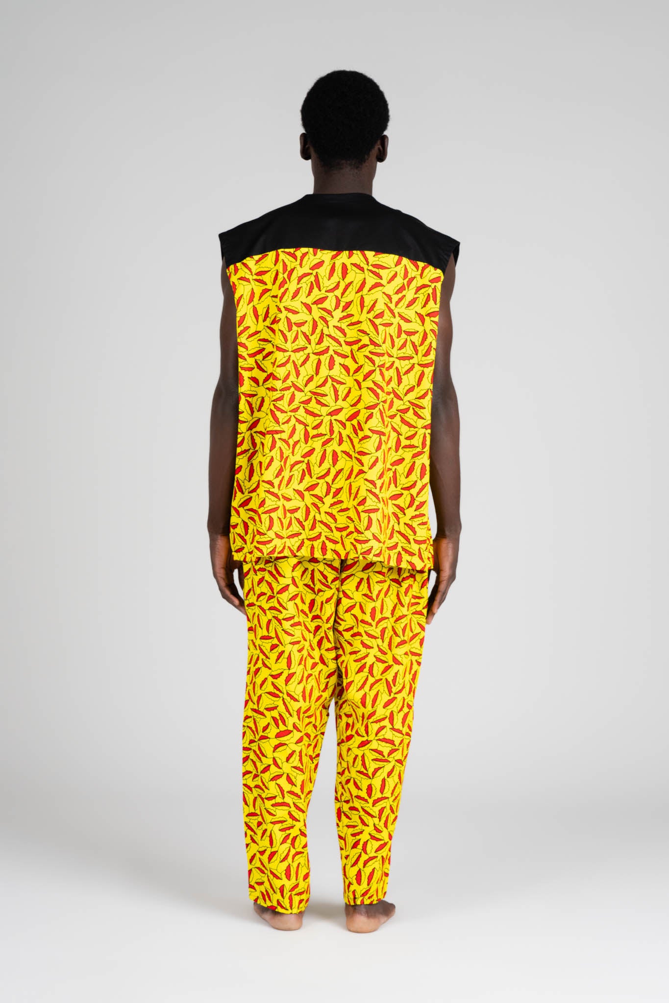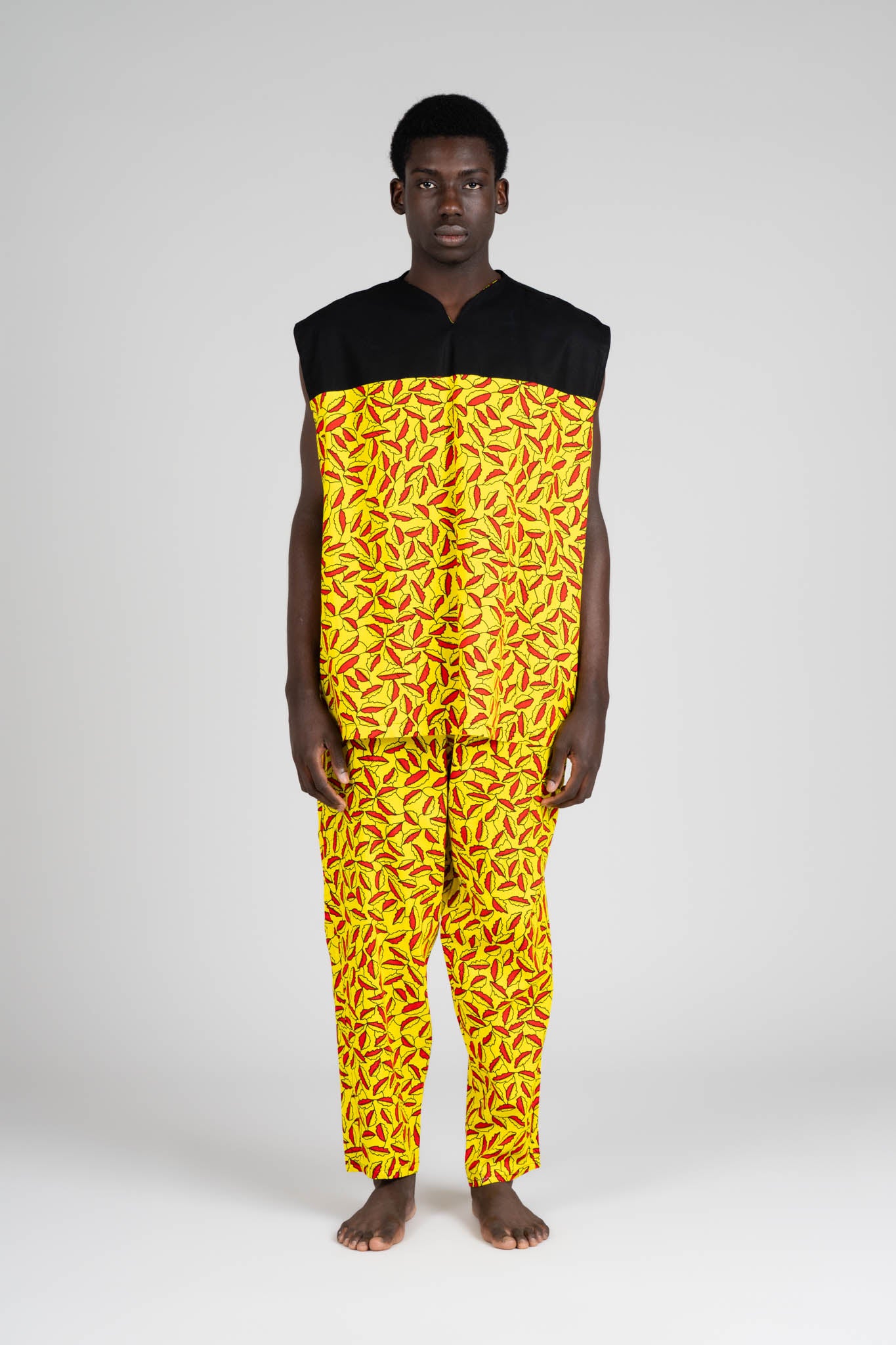 Completo composto da casacca e pantaloni in cotone, caratterizzato da una stampa grafica nei toni accesi del nero e del rosso su base gialla. Il design essenziale e lineare mette in risalto la vivacità del motivo e la leggerezza del tessuto naturale. Pensato per un’eleganza informale e contemporanea, unisce comfort e personalità cromatica.