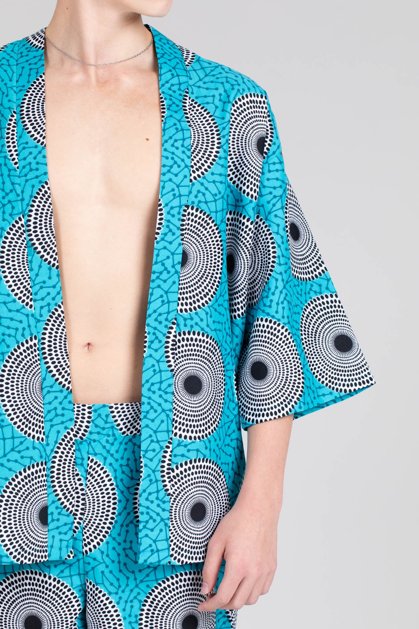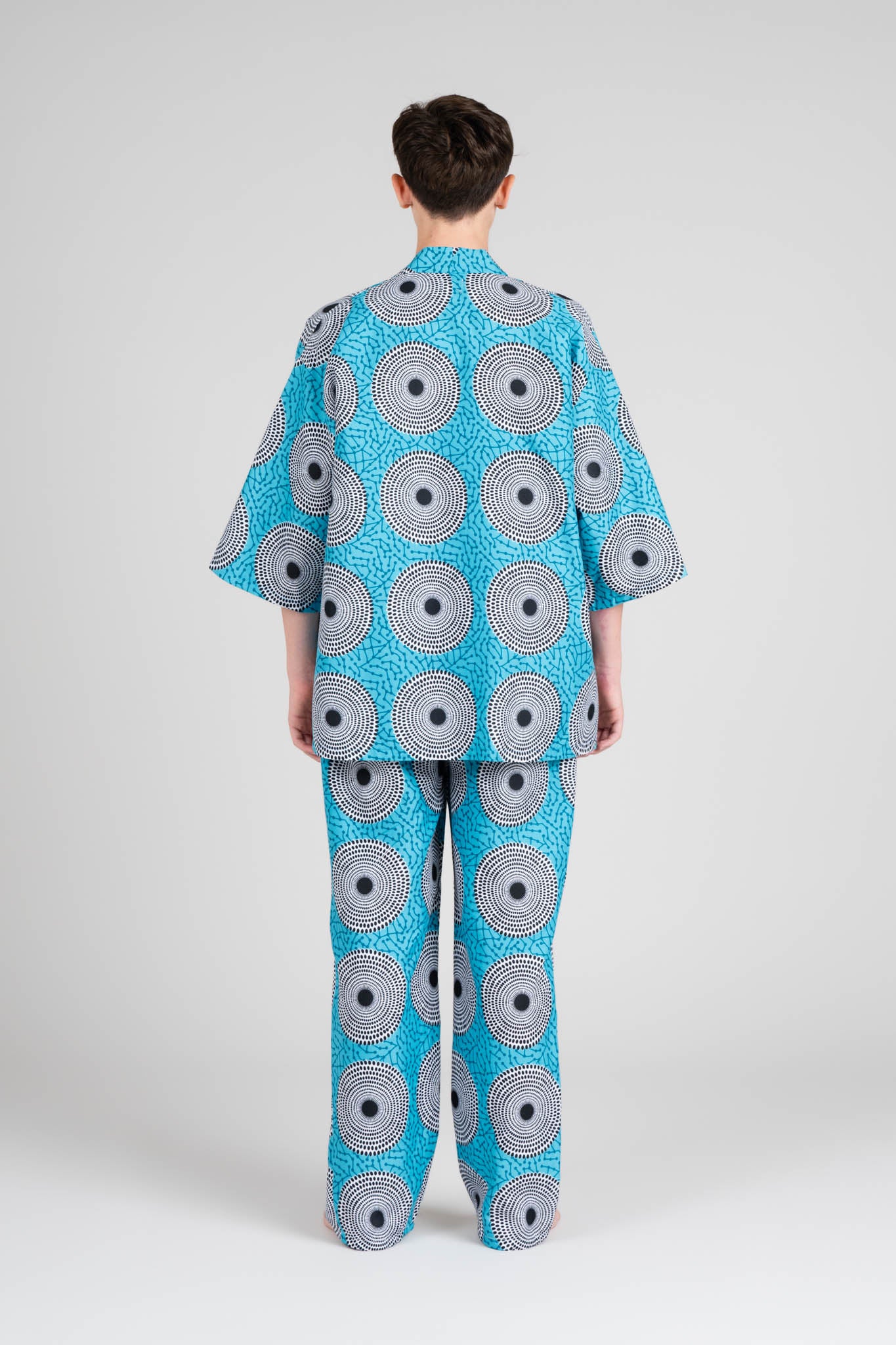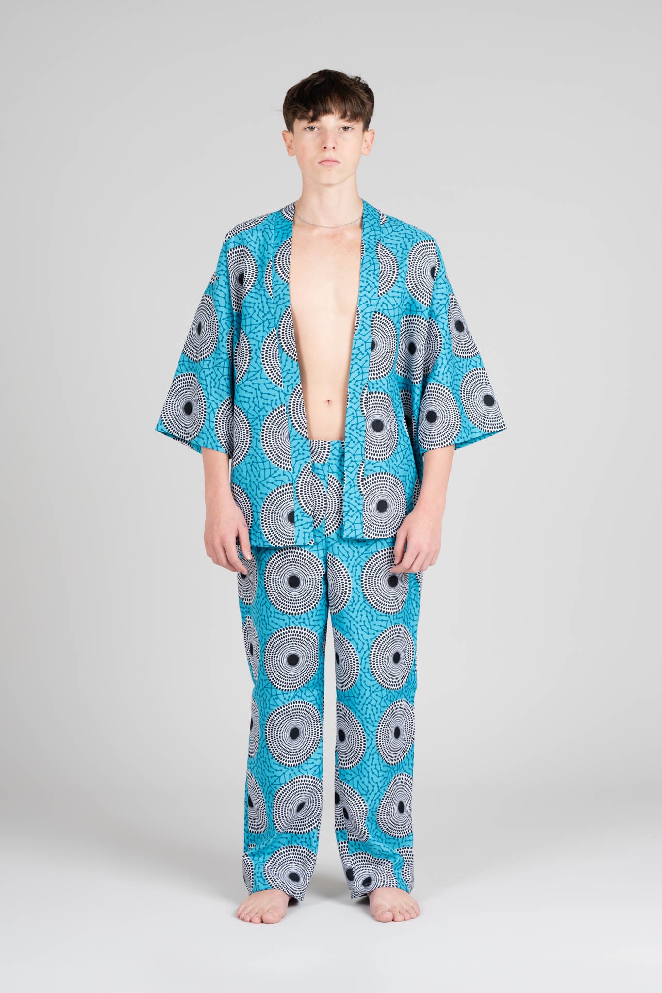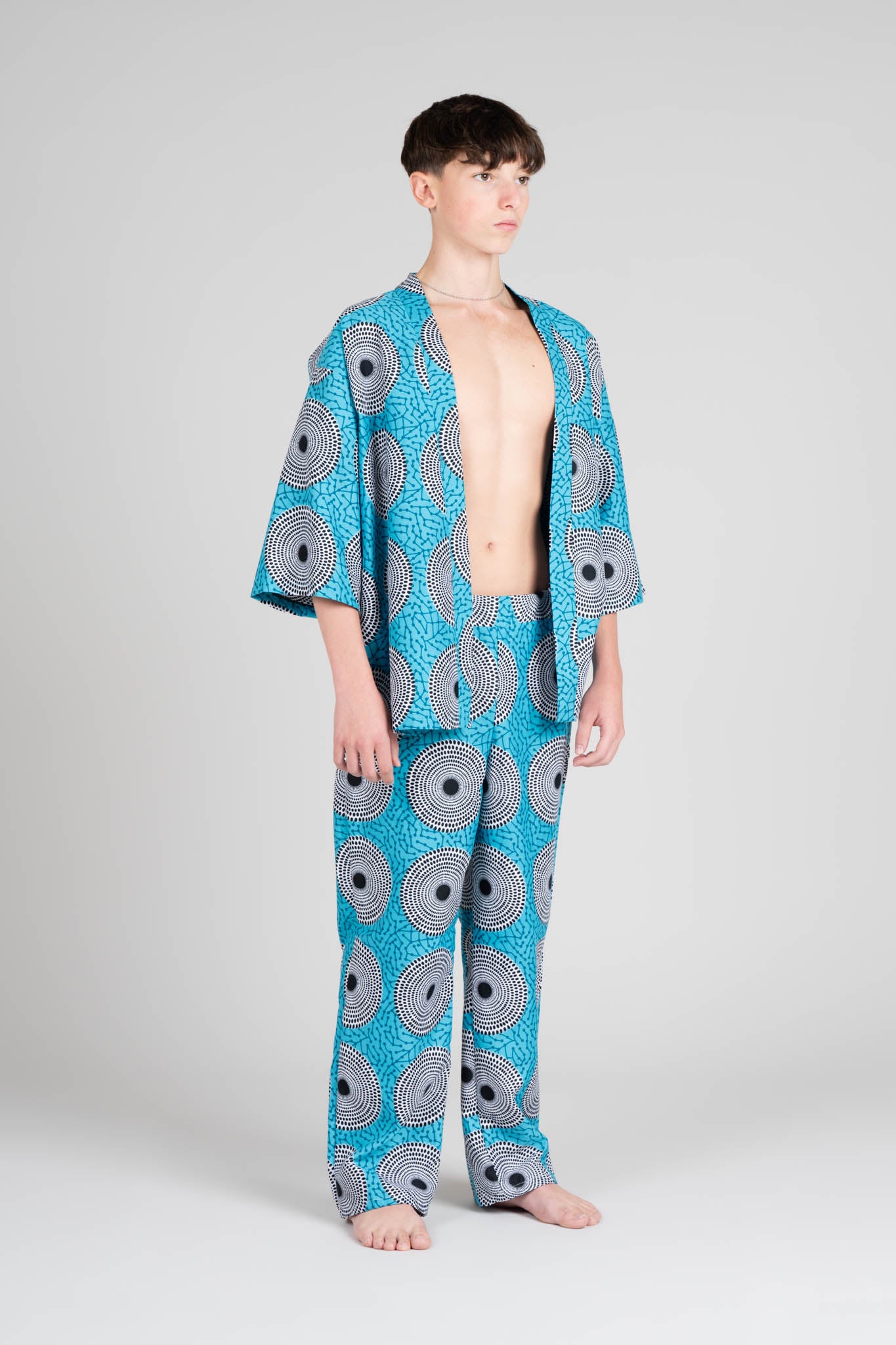 Completo coordinato composto da kimono e pantaloni dritti. Il tessuto presenta una stampa geometrica circolare su fondo turchese, che dona al capo un carattere deciso ma fresco, perfetto per la stagione estiva. La linea rilassata e il taglio morbido assicurano libertà di movimento e comfort quotidiano.