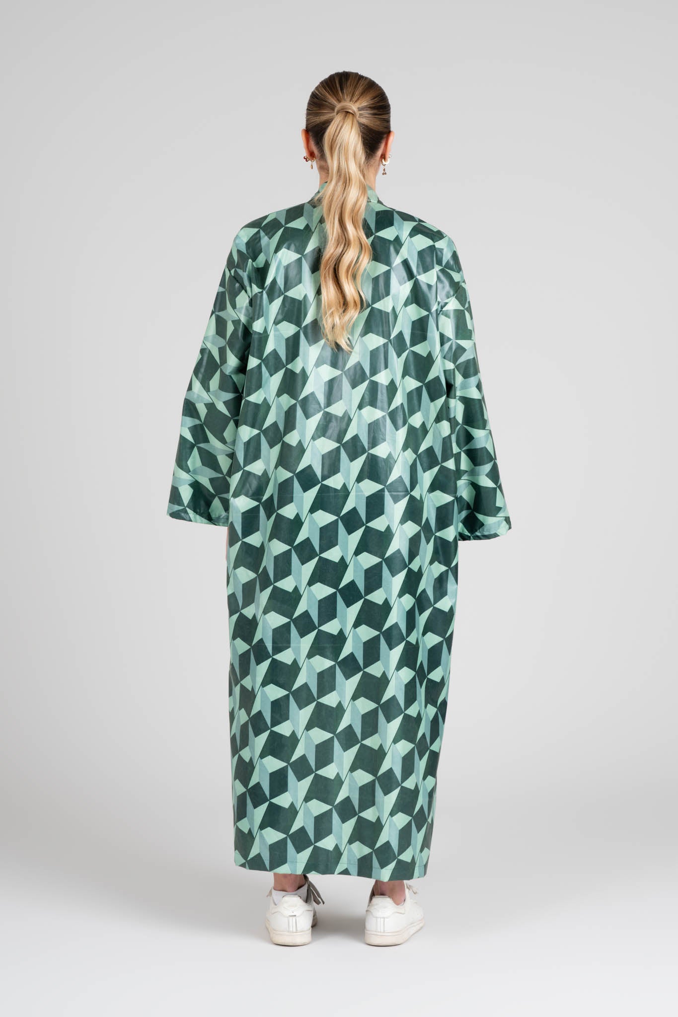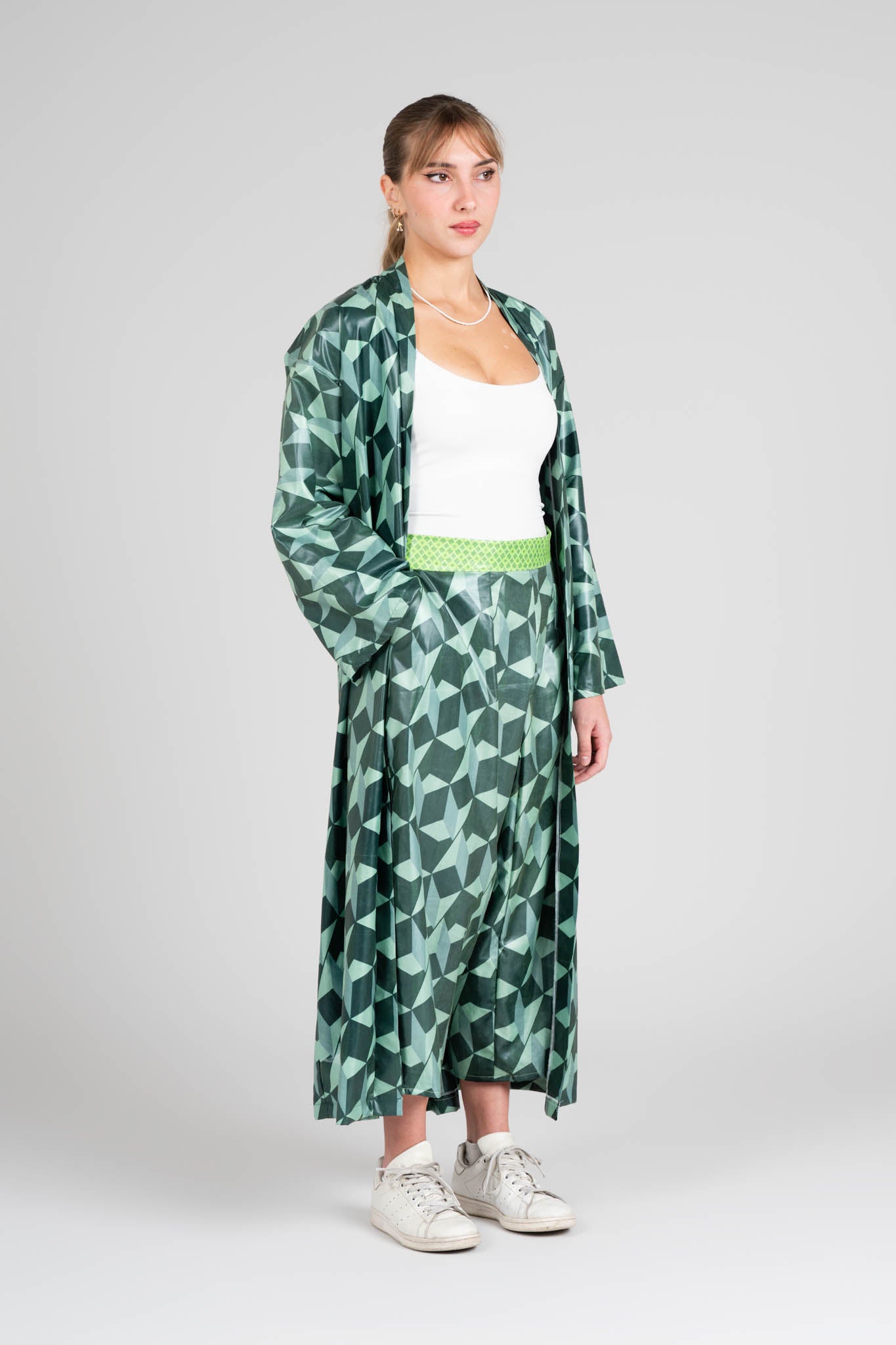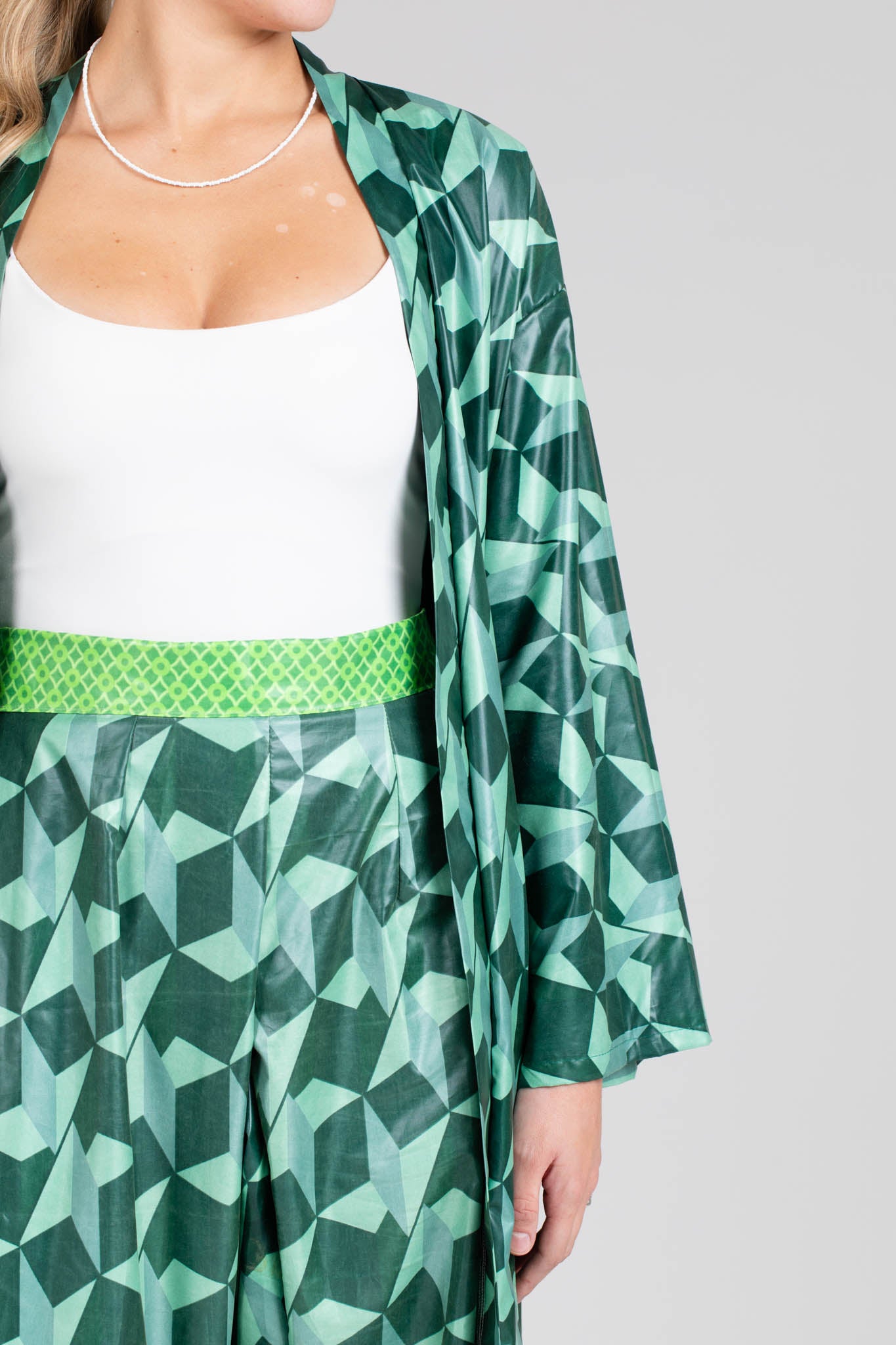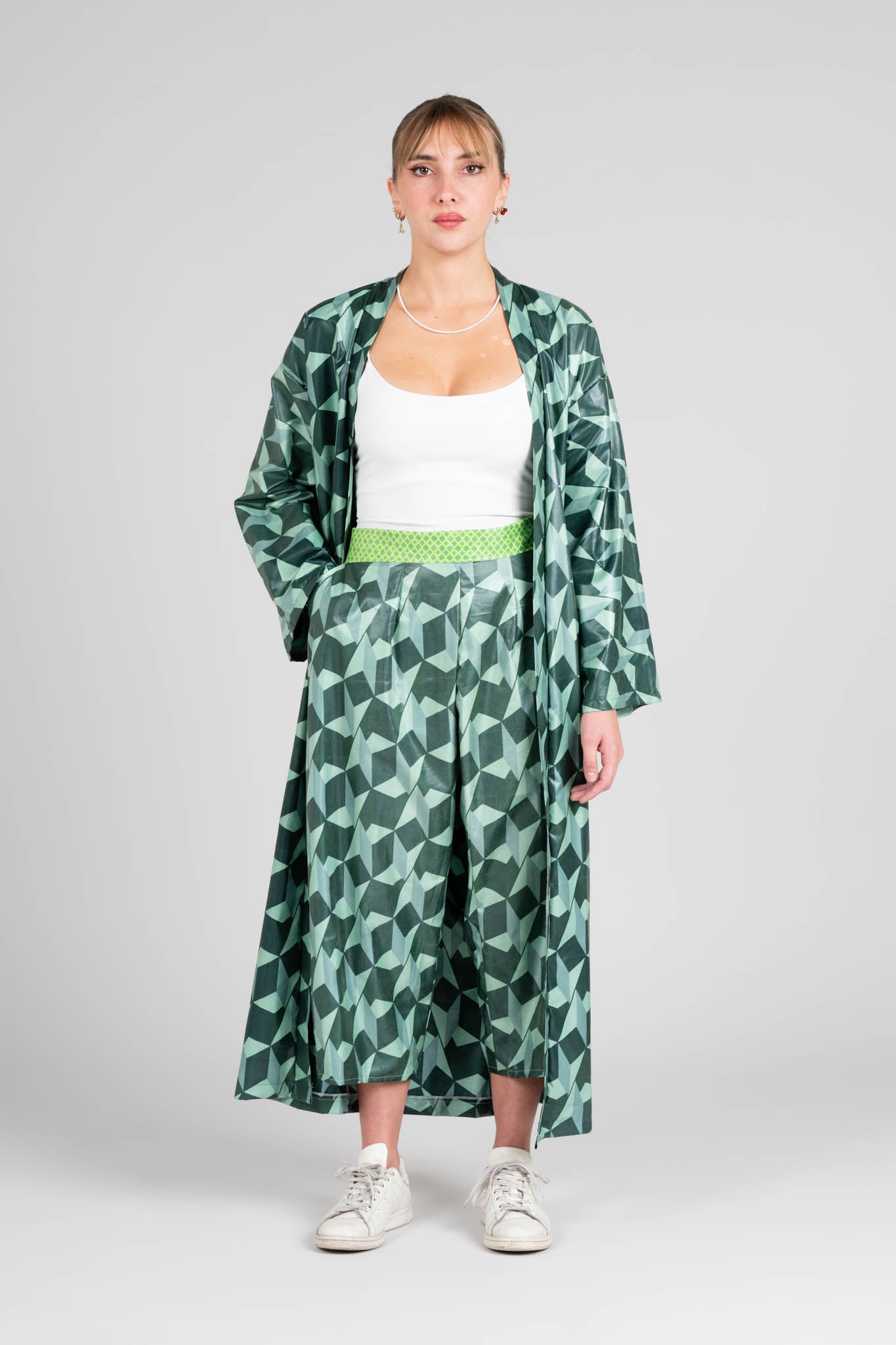 Completo coordinato composto da kimono e pantaloni ampi, realizzati in tessuto cerato dalla texture lucida e fluida. Il motivo geometrico verde, ispirato alle forme tridimensionali, crea un effetto visivo vibrante e contemporaneo. Un look elegante ma sperimentale, che fonde comfort e design.