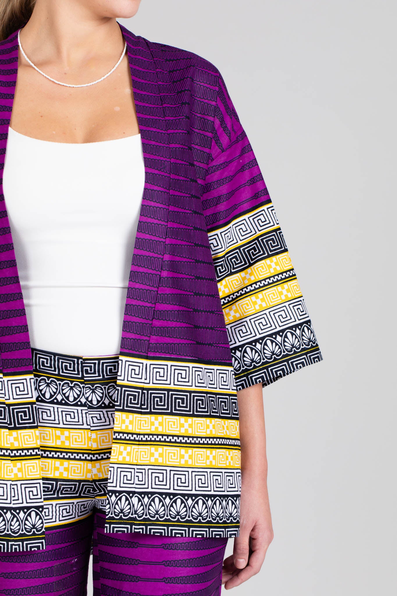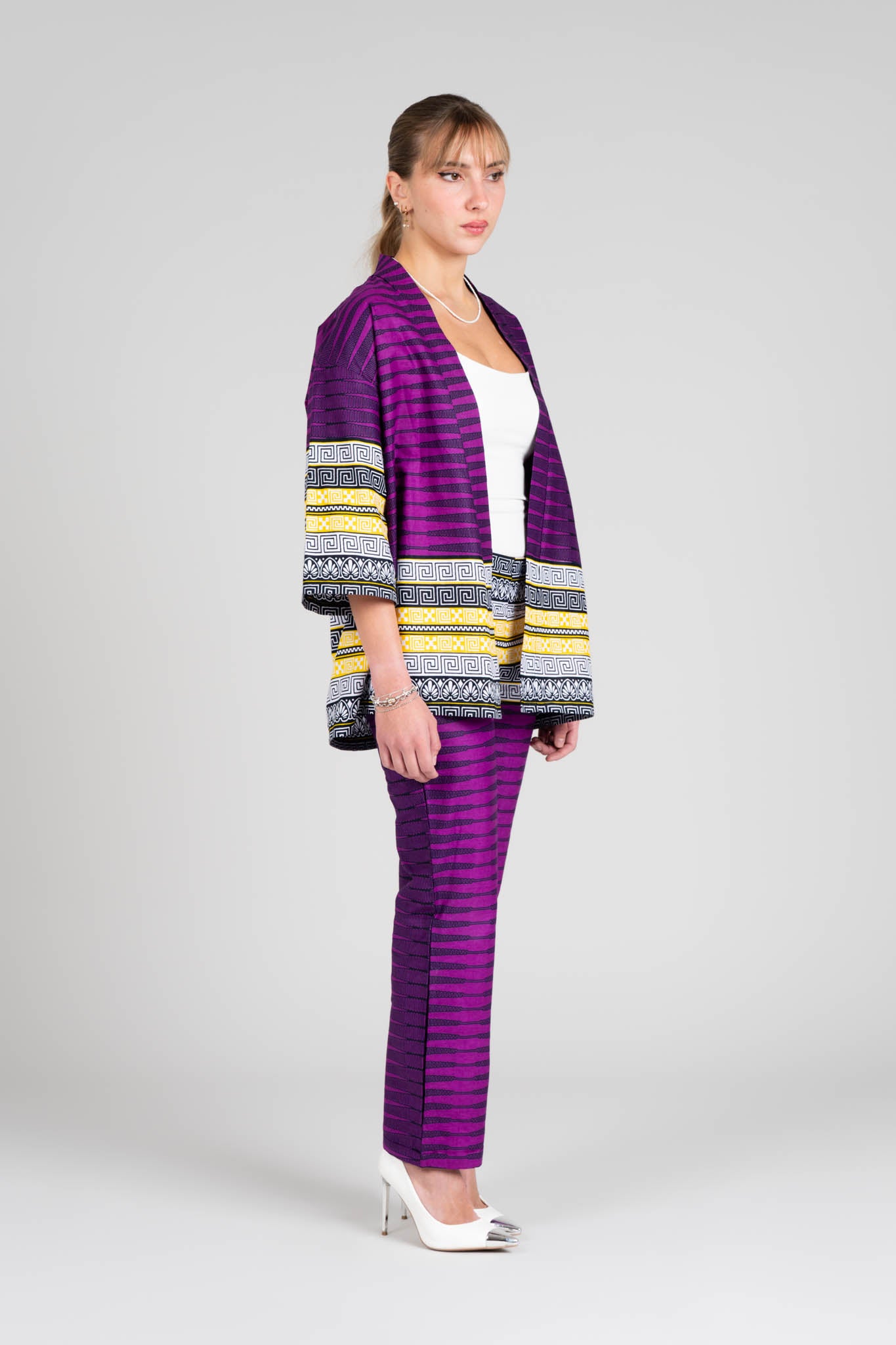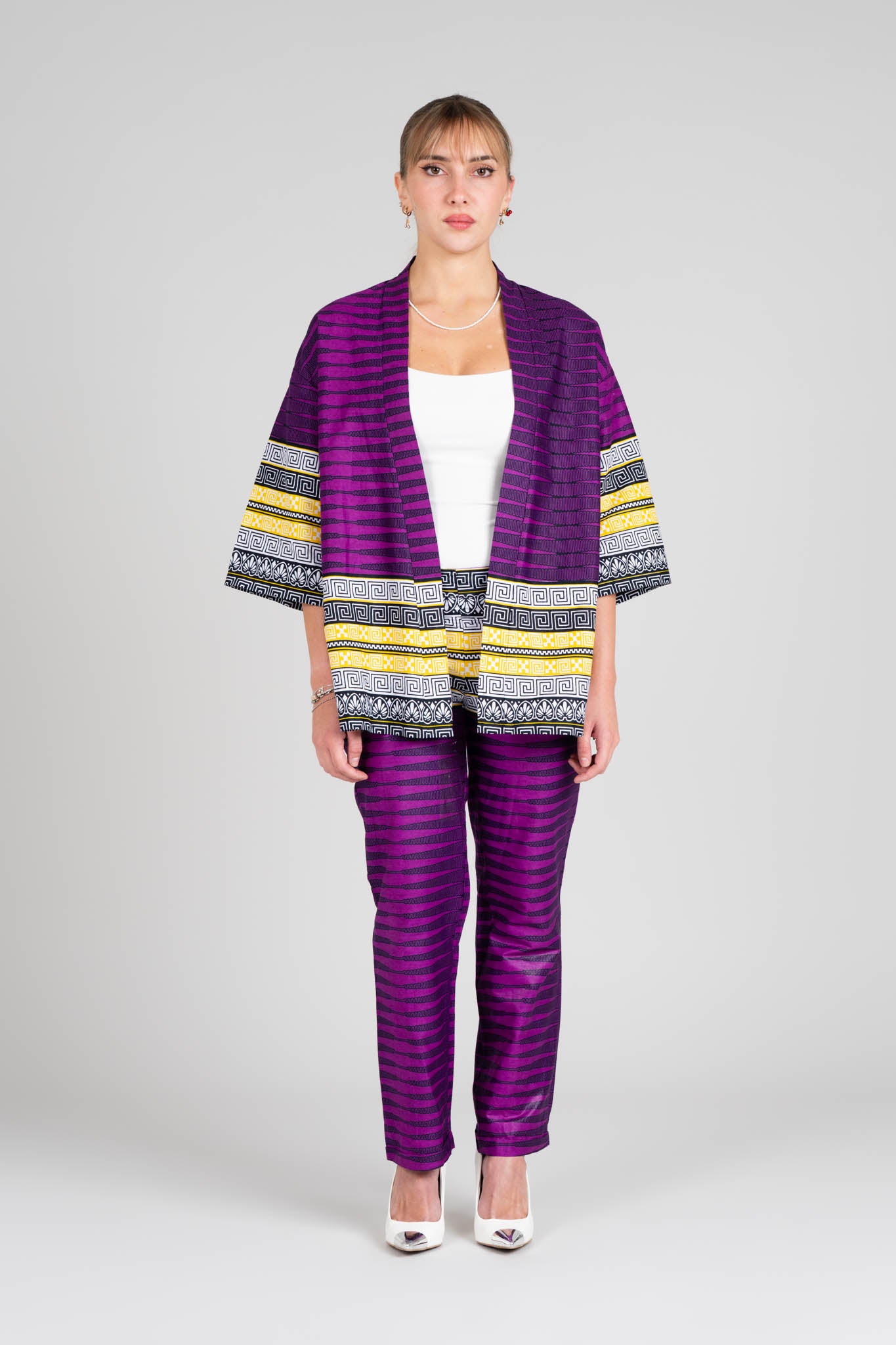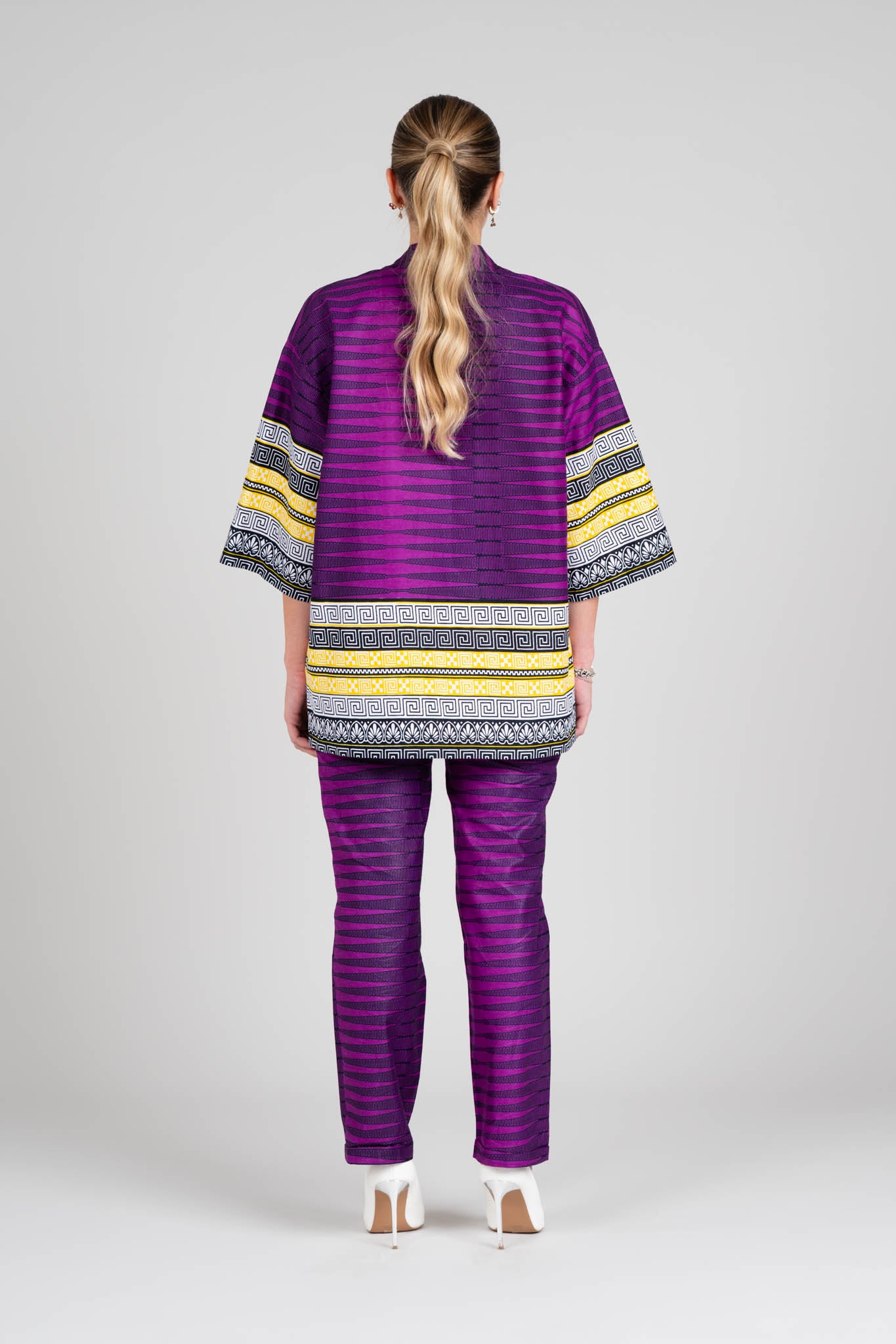 Completo coordinato composto da kimono e pantaloni in cotone con stampa geometrica a righe e motivi ispirati alle decorazioni tradizionali. La palette vibrante di viola, giallo e bianco crea un equilibrio tra tradizione e contemporaneità. Il taglio morbido del kimono e la linea dritta dei pantaloni rendono il completo versatile e adatto sia a look casual sia a look più sofisticati.