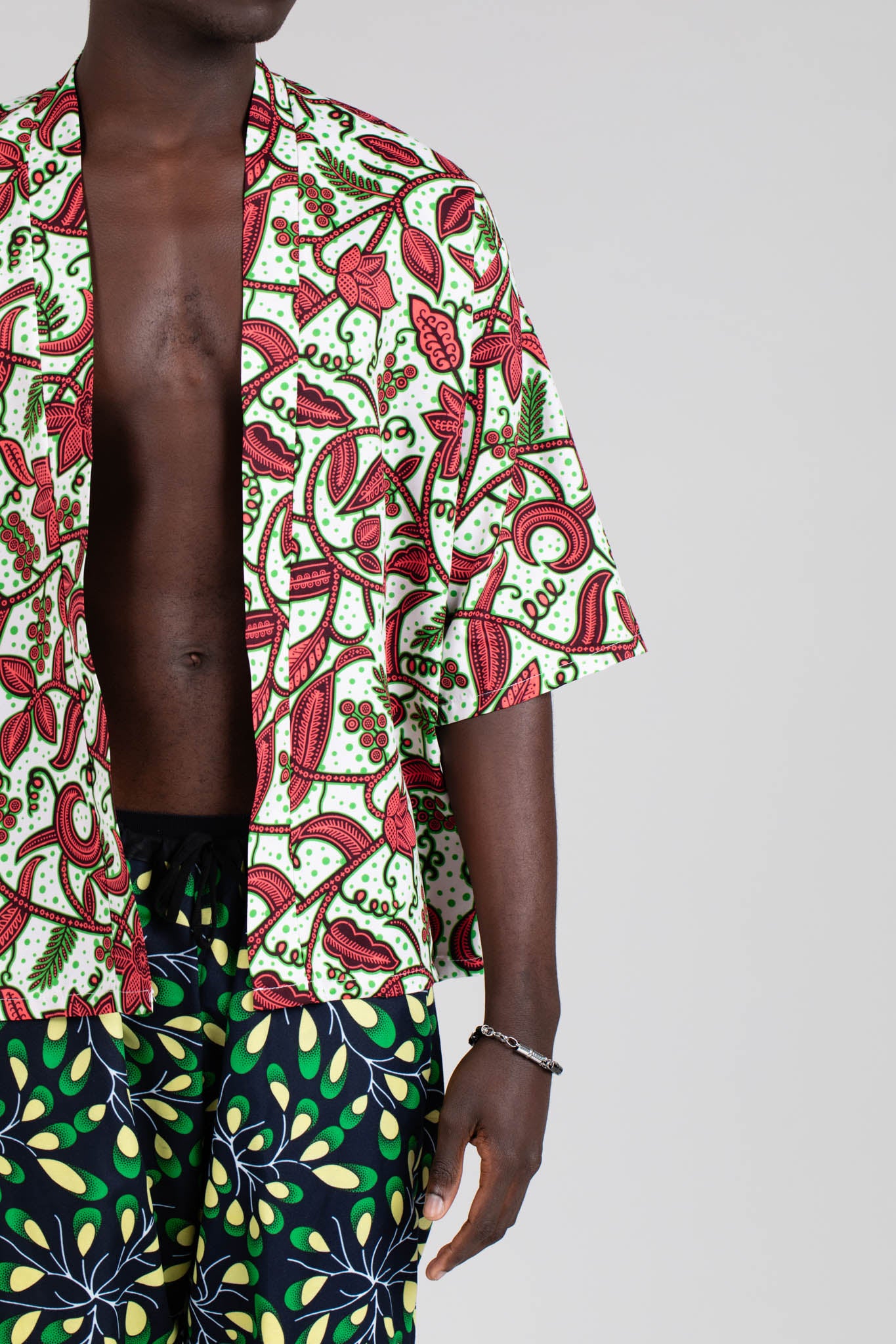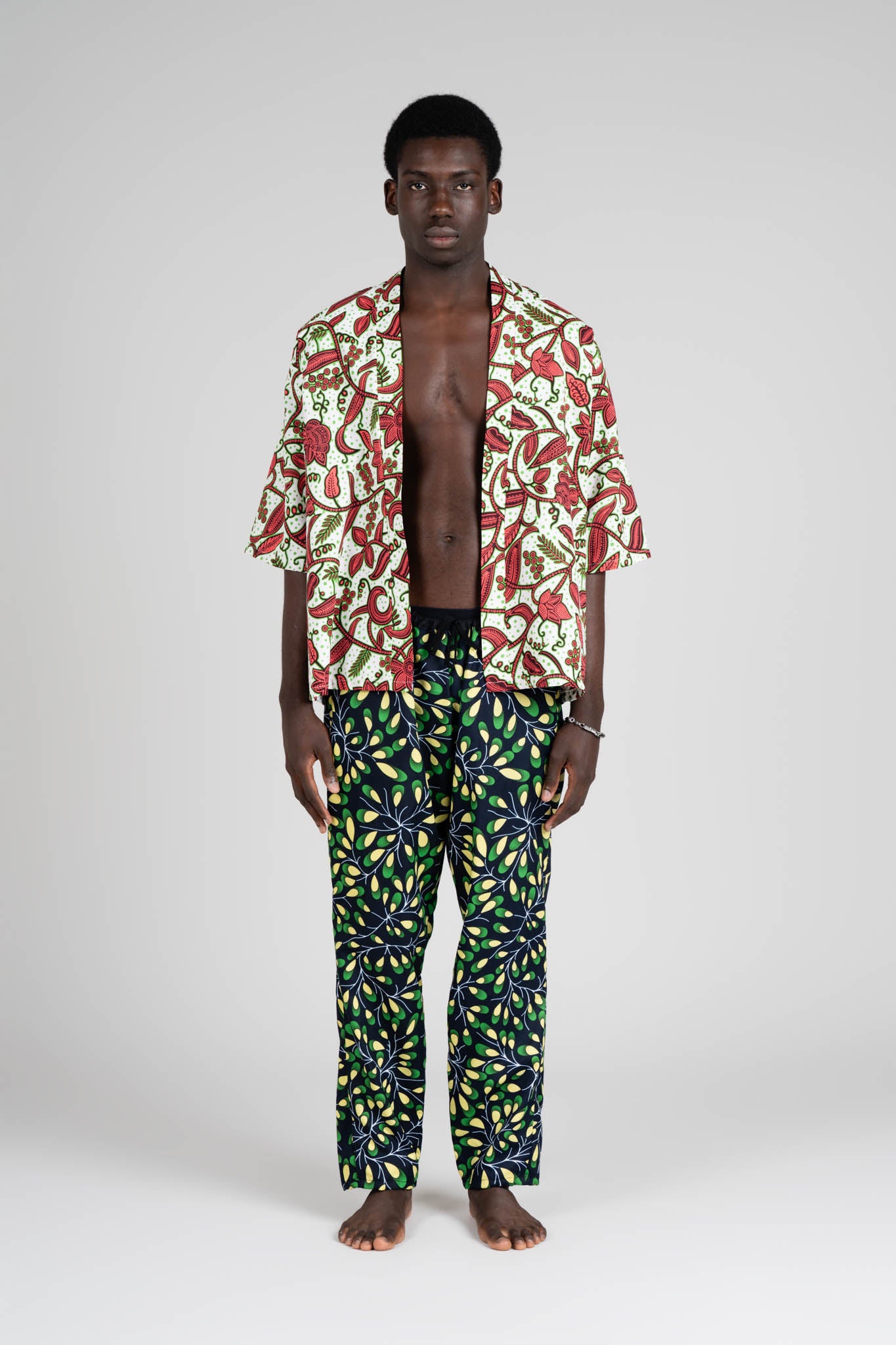 Completo composto da kimono corto e pantaloni in cotone. Le due stampe, differenti ma coordinate, creano un insieme vivace e armonioso, dove il contrasto tra motivi e colori dona ritmo e personalità al look. Un completo leggero e traspirante, dalla vestibilità comoda e fluida, ideale per tutte le stagioni.