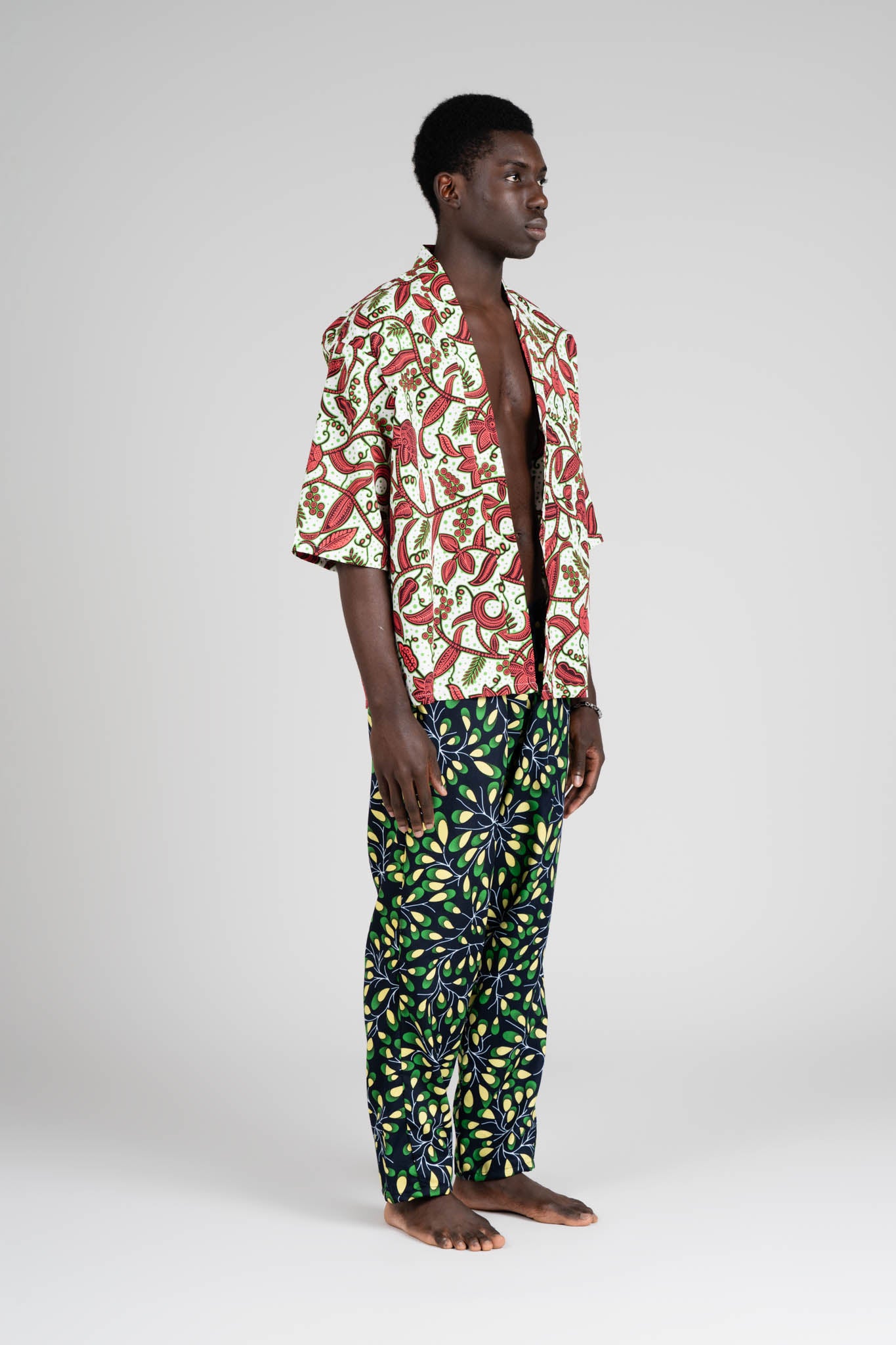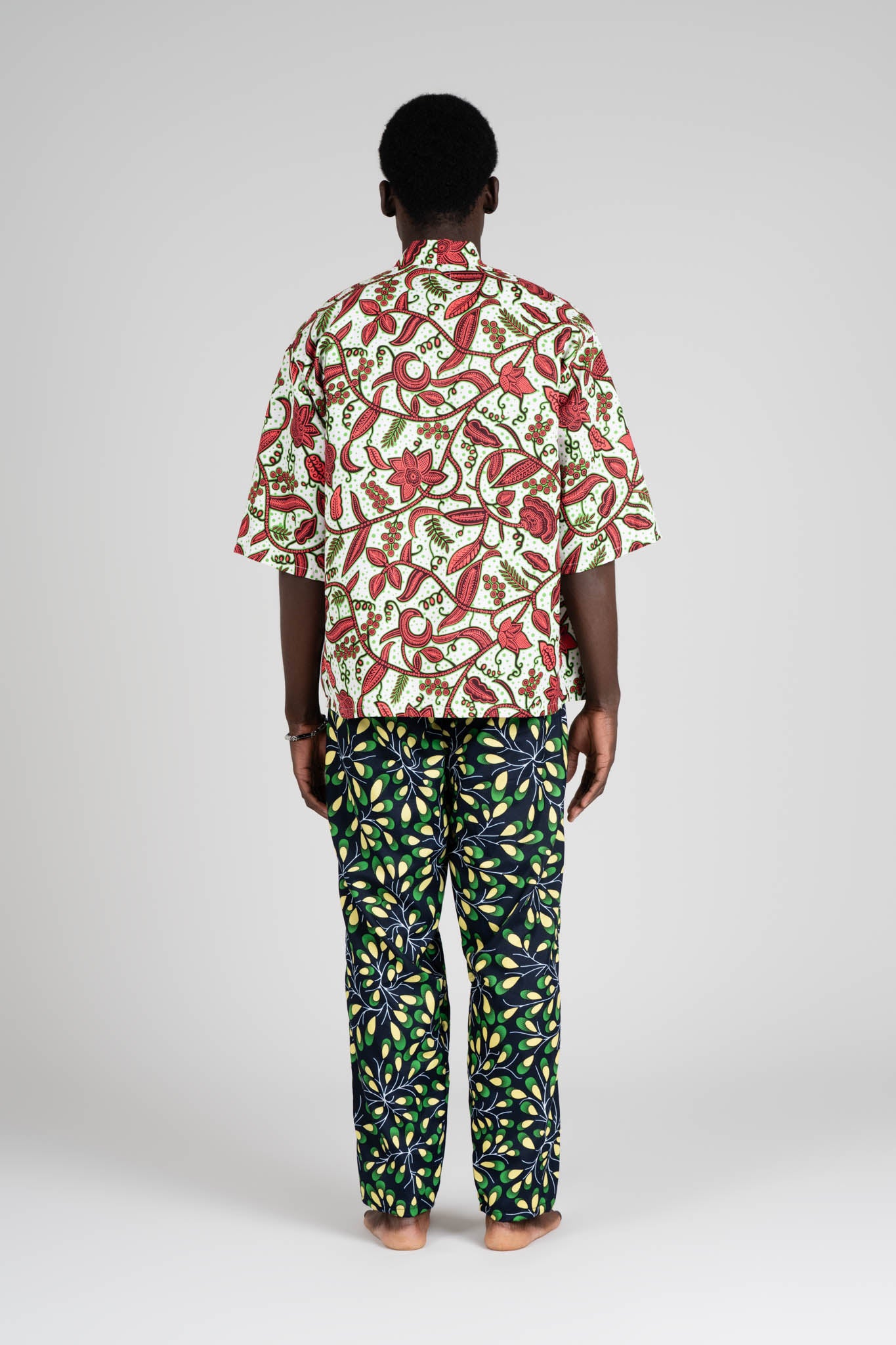NOTE DEL DESIGNER: In questo completo ho voluto unire due stampe africane diverse, ma in dialogo tra loro: la giocosità dei pattern si incontra con la semplicità delle linee, in un equilibrio che racconta libertà e identità. È un invito a sentirsi sé stessi, senza schemi.